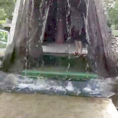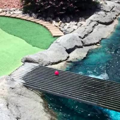 A man runs through a small water fall on a mini golf course and he slips and falls.