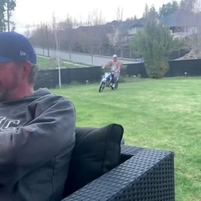 Man rides toy motorcycle down hill in a backyard, he's going pretty fast. He face plants suddenly when he hits the brakes.