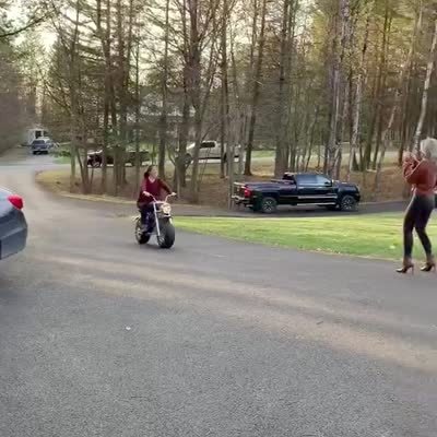 A woman rides a mini bicycle and smoothly arrives in the driveway of a house. The woman then accelerates and crashes into a parked vehicle.