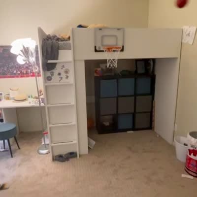 A young boy attempts to toss a small basketball against his bedroom wall and bounce it into a mini-hoop. The ball falls short. He kicks the ball straight up and into the hoop. He looks at the camera.
