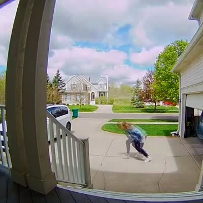 A woman runs underneath a garage door as it closes, but she trips and falls against the car in the driveway. Security footage.