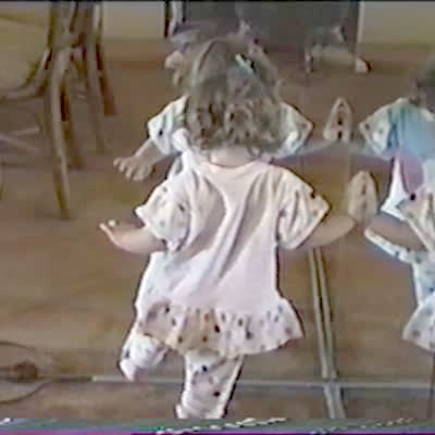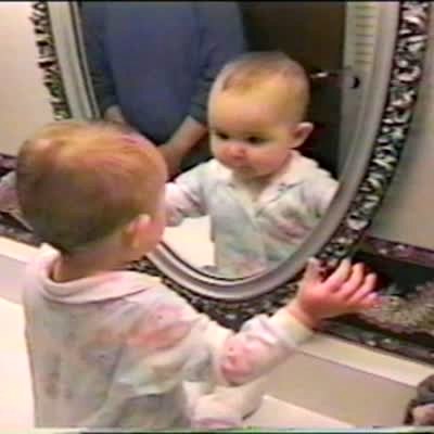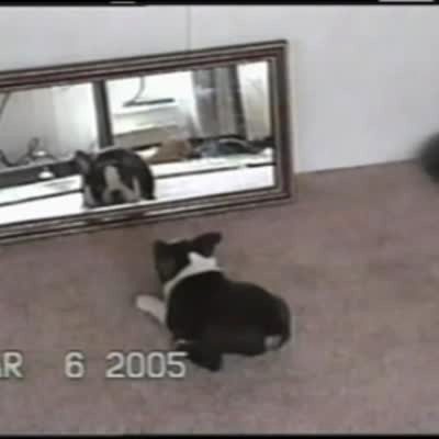 Tortoise looks at his image in a hand mirror as he crawls across the rug towards it.
