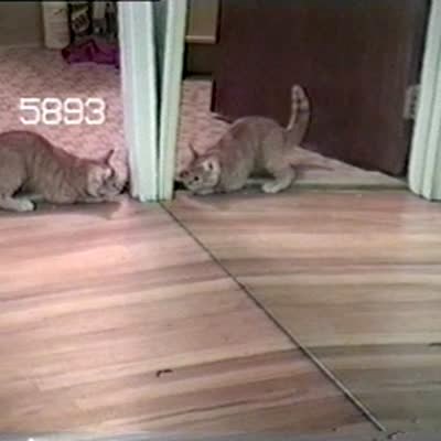 Two cats stand on their back legs and touch their front paws together, like a mirror image copying each other. Mimic. Move in synch .
