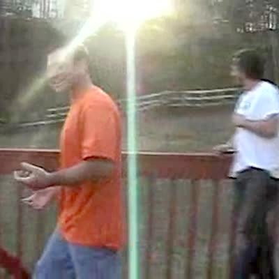 Model rocket zooms right by guy when it launches. SET-UP FAKE