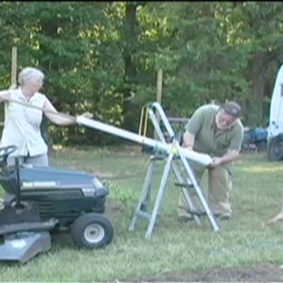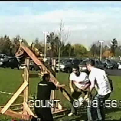 On a grassy field by a high school, 3 boys try to launch a ball with a catapult. It misfires and the ball hits one boy on the head. Trebuchet was built for physics class. Music over clip, short heads & tails.