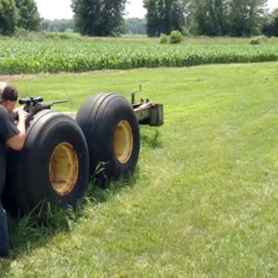 A man aims a gun on top of a tire and accidentally shoots the tire right in front of him.