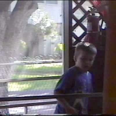 A teen boy asks his dad what noises different animals make in a living room. He asks him what a whale says, then takes a sip of water and spits it in his dad's face.