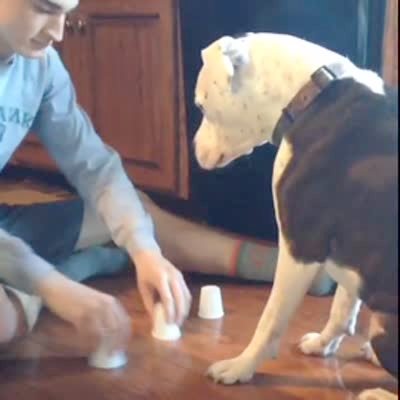 A teen boy puts a treat under one of three cups and mixes them up at home. A pitt bull dog identifies the cup and retrieves the treat.
