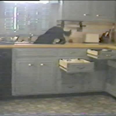 Black lab mix dog opens up a kitchen drawer with his paw, climbs in then opens up a 2nd drawer and climbs up like stairs onto the counter.
