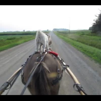 A small mix breed dog bounces up and down as it stands on the back of a horse pulling a buggy down a road.