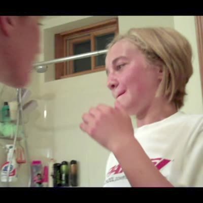 In a bathroom, a woman waxes her teen daughter's lip. The teen girl gasps and jumps up and down in pain. A young girl the camera boy and a mixed breed dog watch. long clip
