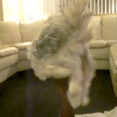 A boy holds a yorkie/maltese mix dog over a fan blowing in a living room. As the air blows the dog's fur up, the dog moves its paws like it's swimming on air.