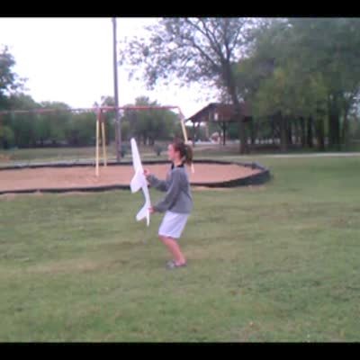 Man throws model airplane, it comes back around & hits another man hard in the head, knocks him down. Glider. Park.