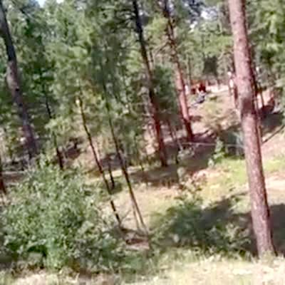 A man tries to stop another man's momentum on a zip line outdoors and gets stuck hanging onto him in the woods. Short tail.
