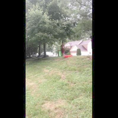 A man rides down a bounce slide and bounces at the bottom by the kiddie pool and crashes through the wall and runs through the yard and crashes into the fence and breaks it.