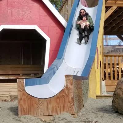 A dog slides down a slide and jumps on a woman, then she falls down in a playground.