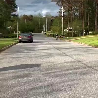 A man chases after his car as it rolls down the driveway and he tries to stop it. He opens the door and falls in the street while the car crashes into construction cones. Security footage.
