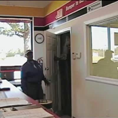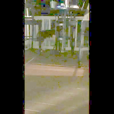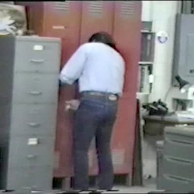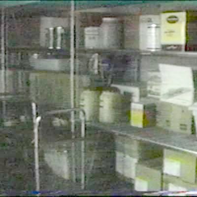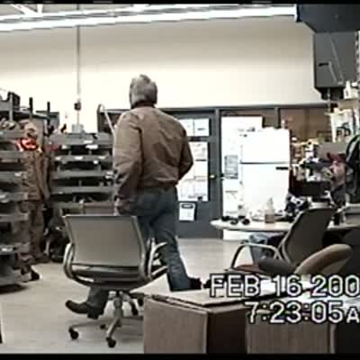 Man dressed in a monster costume hides between shelves & scares co-workers. Several takes, all mild reactions. Practical jokes. Warehouse.