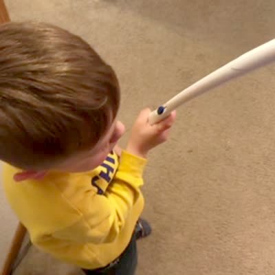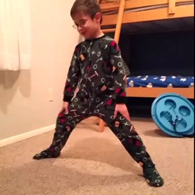 A boy in pajamas stands still as his dad drives a remote-control monster truck between his legs. The RC car jumps into the air partway through and hits the boy in the groin.
