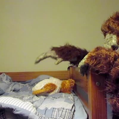 "Nice Try, Mike" Man in bigfoot costume tries to scare little girl sleeping in bunkbed, girl says "nice try, Mike."