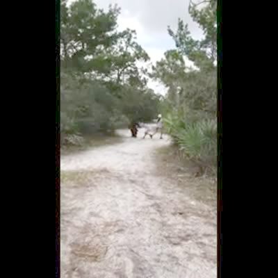 Two teen girls run through a forest trail but a man wears a Ghillie suit costume and jumps out of a bush and scares them and they scream and fall down. monster