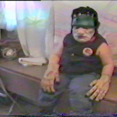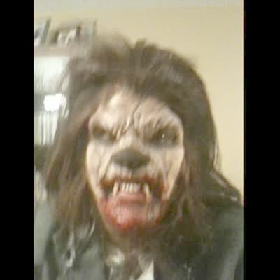 Man in elaborate Halloween costume with make-up talks & barks into the camera, his fake fangs fall out.