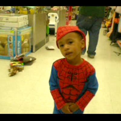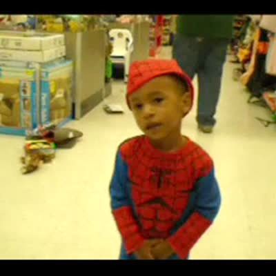 Boy dressed in Spiderman costume walks around costume store. Dad scares him while wearing a mask. Practical joke. Halloween.