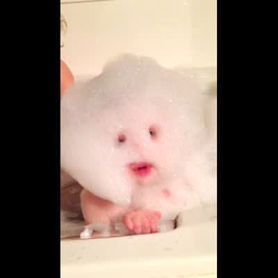 A young boy with bubbles all over his head wishes someone happy birthday.