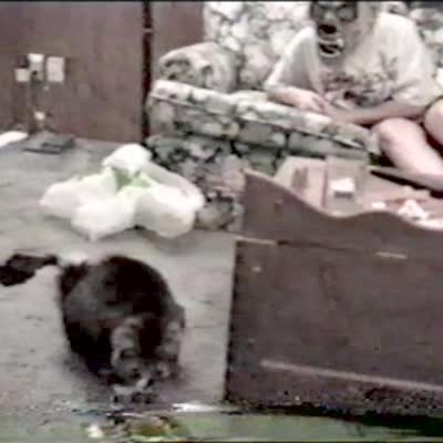 A man wears a scary monster Halloween costume and walks up to a front porch. A Husky dog sits on the porch but gets scared and hides. The dog tries to run off the porch but the leash gets stuck onto a table and the dog pulls the table across the porch.