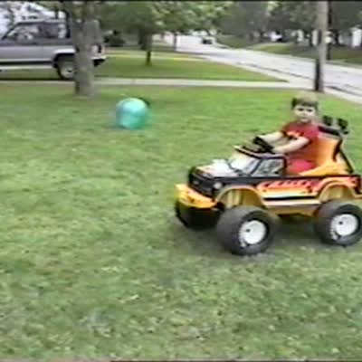 Tot boy drives toy monster truck as little brother holds onto the back of it. Little brother eventually gets dragged along the grass and his pants come down