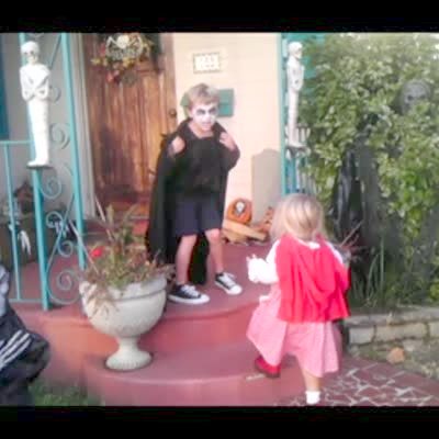 "Little Red Rescue Hood" A boy and a young girl in Halloween costumes walk up to a front door of a house while Trick or Treating. A toy skeleton monster rises up on the front yard. The boy screams, afraid of it. The young girl walks over to the toy and punches it in the face.