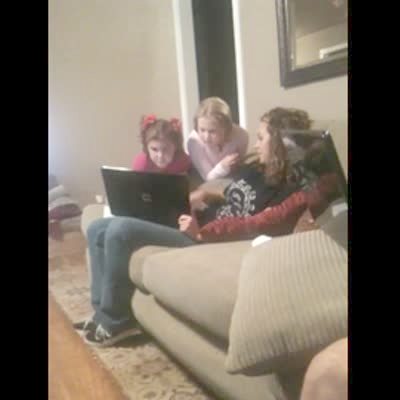 2 little girls scream and disappear behind a couch when they react to a scary image on the computer. Practical joke. Scare.