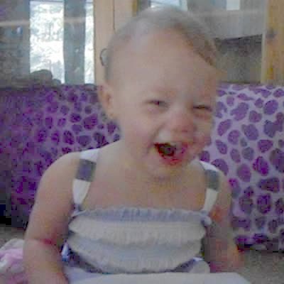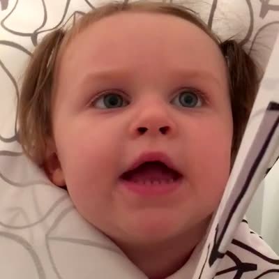 A baby girl in a dress has a funny laugh when her dad makes duck noises indoors.