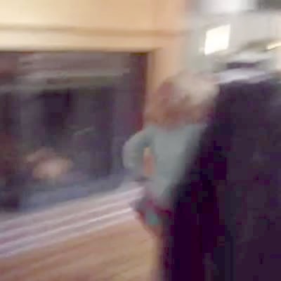 A man pretends to be a monster while chasing his tot daughter indoors. At :18, his tot son walks up and punches him in the groin.