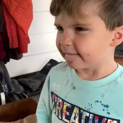 "Little Donut Denier" A tot boy has chocolate on his face and stands next to an opened box of donuts. He says "the monster attacked me and gave me a donut."
