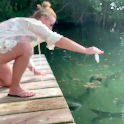 A woman holds a small fish above a pond. A large fish jumps out of the water and tries to eat it but the woman screams and backs away.