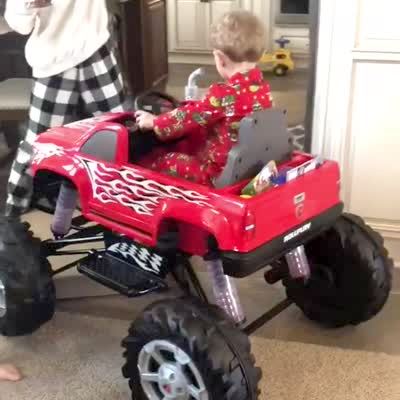 A remote-controlled monster truck rolls out of a wrapped gift box and towards a young boy sitting on the floor. He stands up and screams.