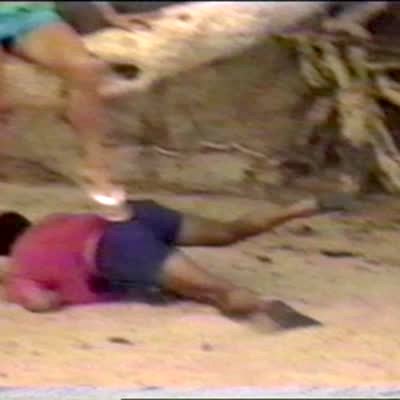 A montage of videos of goats as they faint and fall over in a yard with a woman and two young girls.