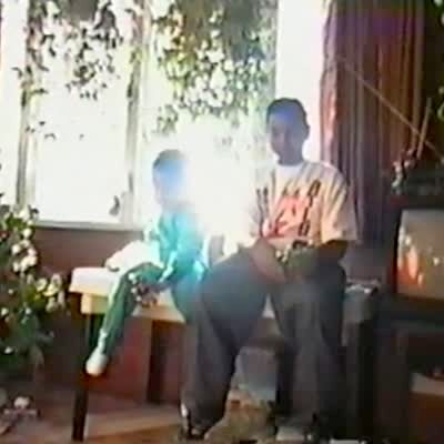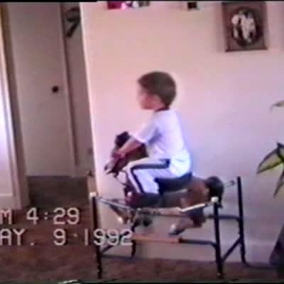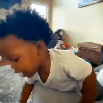 A young boy with boxing gloves pretends to do a training montage in the living room while "Eye of the Tiger" plays. He punches the bag, but slips and falls. Music rights not cleared.