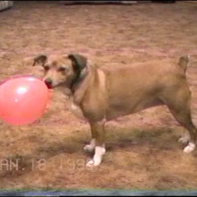 Punching Bag Dog. Dog holds balloon in mouth and shakes it around. (montage)