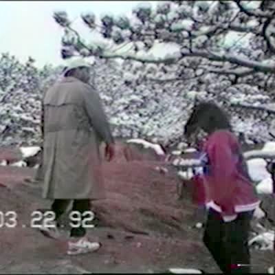 Snow Wife. Husband pushes tree, snow falls on woman. (montage)