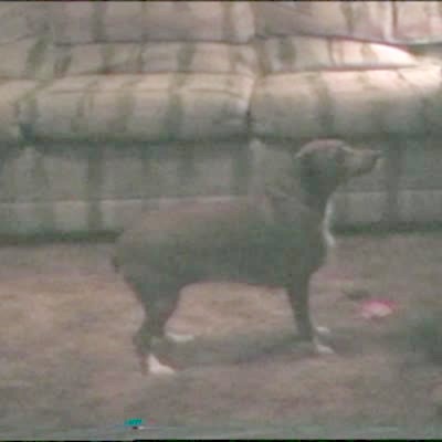 DANCING DOG. Dog dances on his butt as drum machine plays. (montage)