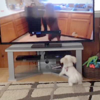A maltese dog jumps up on a couch when asked if she wants to watch AFV. She runs to the TV when a dog montage comes on and runs in circles repeatedly, barking and jumping each time she's by the screen.