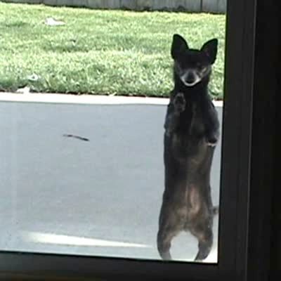 Dog stands on back paws at door and appears to be dancing to salsa music. Montage maybe.
