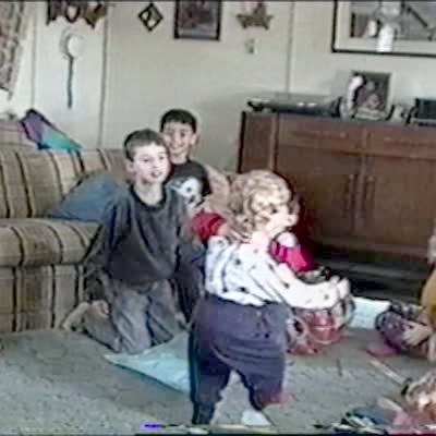 Tot boy sits on table with older brother, says thanks to Santa for his toys, falls off table face first onto floor. No recovery. *montage