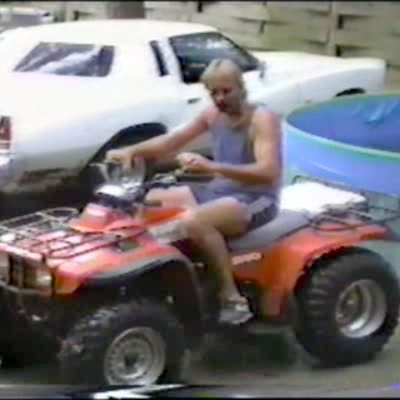 Summertime Bonehead. Man drives tractor backwards into pool. (montage)