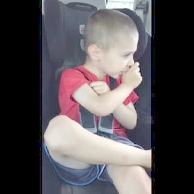A woman yells out a car window at a young boy on a sidewalk, "Quit being in a bad mood!" The boy responds, "Because of you, and your mouth!"