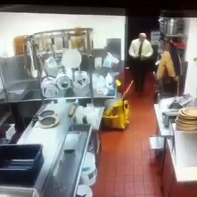 A young man dances and sings as he mops a floor, then he falls out of a door while he works at a dog groomer. Security footage.