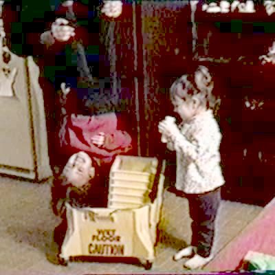 A young girl backs up and falls into a mop bucket full of water and tips over onto floor in kitchen.