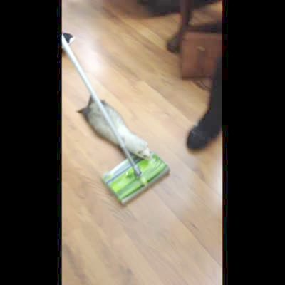 A ferret bites onto a mop and drags along the floor as a woman pushes the mop back and forth on the floor.